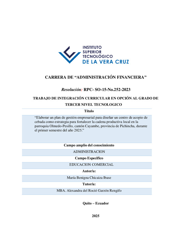 María Benigna Chicaiza Ibase, ““Elaborar un plan de gestión empresarial para diseñar un centro de acopio de cebada como estrategia para fortalecer la cadena productiva local en la parroquia Olmedo-Pesillo, cantón Cayambe, provincia de Pichincha, durante el primer semestre del año 2025.”,” ISTVC, consulta 26 de octubre de 2025, https://www.repositorios.istvc.edu.ec/items/show/9.